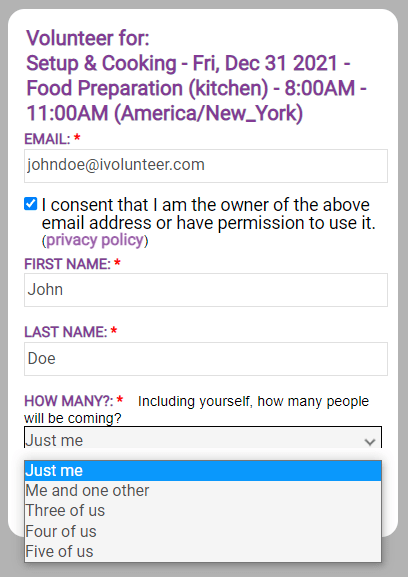 In the example below, when John Doe signs up, he can enter the number of people coming including himself.