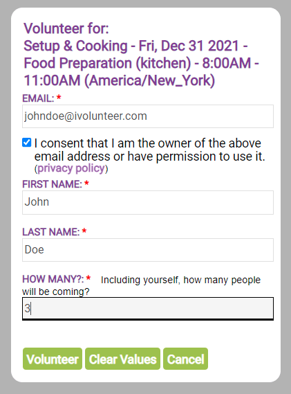 Volunteering a group of people with one sign up has gotten easier in ivolunteer. This post has been updated to reflect new functionality. Now a participant can sign up a group and later adjust the number of people later from their My Commitments portal.