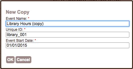 When you click this button, you will be prompted to change the Event Name, the Unique ID, and the Event Start Date. When you’ve filled in the information, click the “OK” button at the bottom of the form. If you didn’t change any information, you can always go back to the Details page and change necessary information.