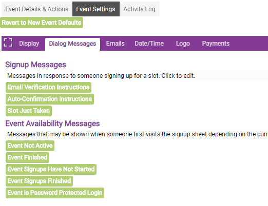 These Event Settings allow you to modify Signup and Event Availability messages, as needed. Click on each message type to view and modify the default message.